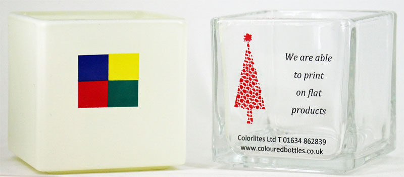 Square Glass Bottles and Jars like Glass Candleholders can be printed up to about 100mm square in area.